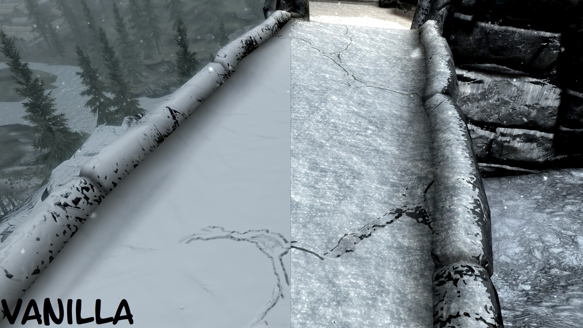Ванильный снег имеет очень некрасивый "белоснежный" вид, как будто взяли белую краску и покрасили объекты. Данный мод это исправляет и делает снег "Динамичным", а ванильной игре он "Статичный". Полная переработка снега. Не только его текстур, шейдеров и мешей, а даже анимации движения снежных частиц. Теперь снег будет действительно реалистичным. Около 1070 текстур на снежных объектах Скайрима применяется как "Динамический Снег".