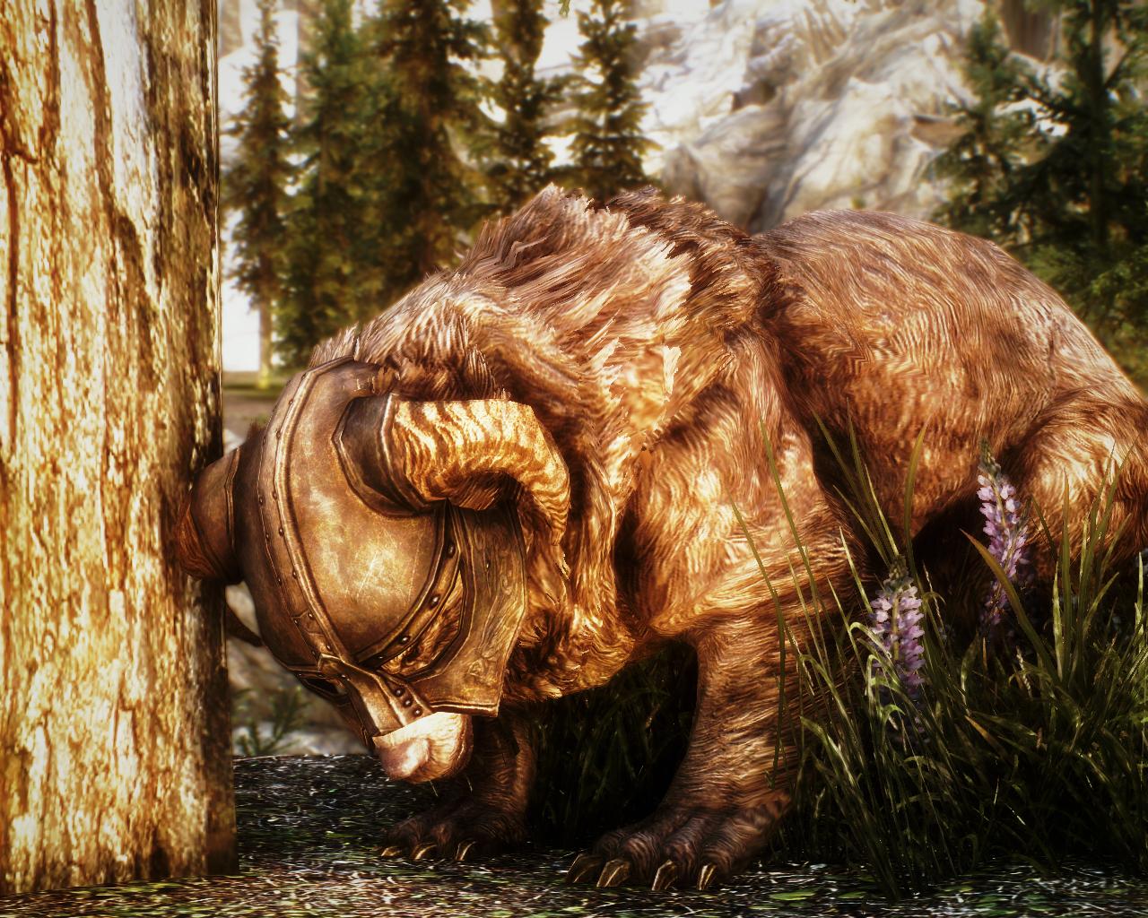 Это гениально. Ему еще умение "Игра на гармошке" и "Коробочка" да бухать научить и будет просто айс! Скайрим - сказка. Почему бы в сказке не бывать медведю в шлеме ГГ? Мне понравился мод.