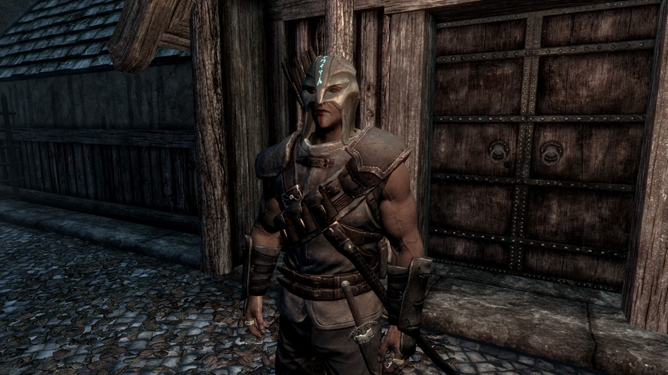 Маска имеет активное зачарование ночного глаза, которое активируется когда вы крадетесь. В броню вшито заклинание "Разрушитель заклинаний", оно в свою очередь активируется когда вас намереваются атаковать.