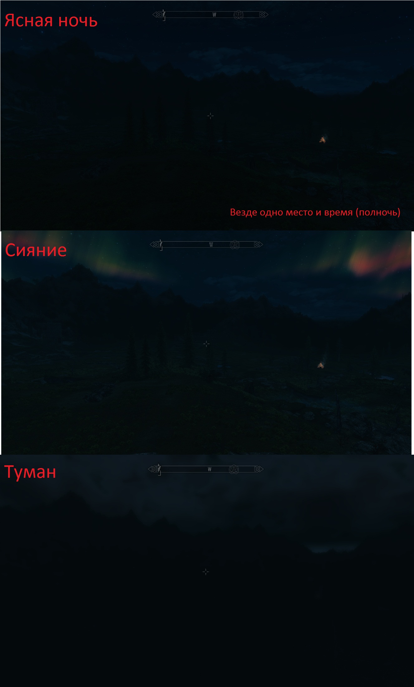 Обратите внимание на то, как выделяется дымка на фоне серых гор. Выделяется, словно, заплатка какая то. А на втором и третьем скрине одно и то же место в ясную ночь и ясную ночь с северным сиянием. И как сильно отличается освещение - которое, по логике, с сиянием должно быть светлее или хотя бы освещать землю отблеском. Так же, если переключить погоду на туман или снежную бурю - будет еще светлее, а это согласитесь совсем не реалистично. В своем плагине я это учел, так под сиянием будет чуточку светлее, а трава получит характерный отблеск. Самые темные ночи, как в реальности так и по логике при погоде туман, дождь или снег.
