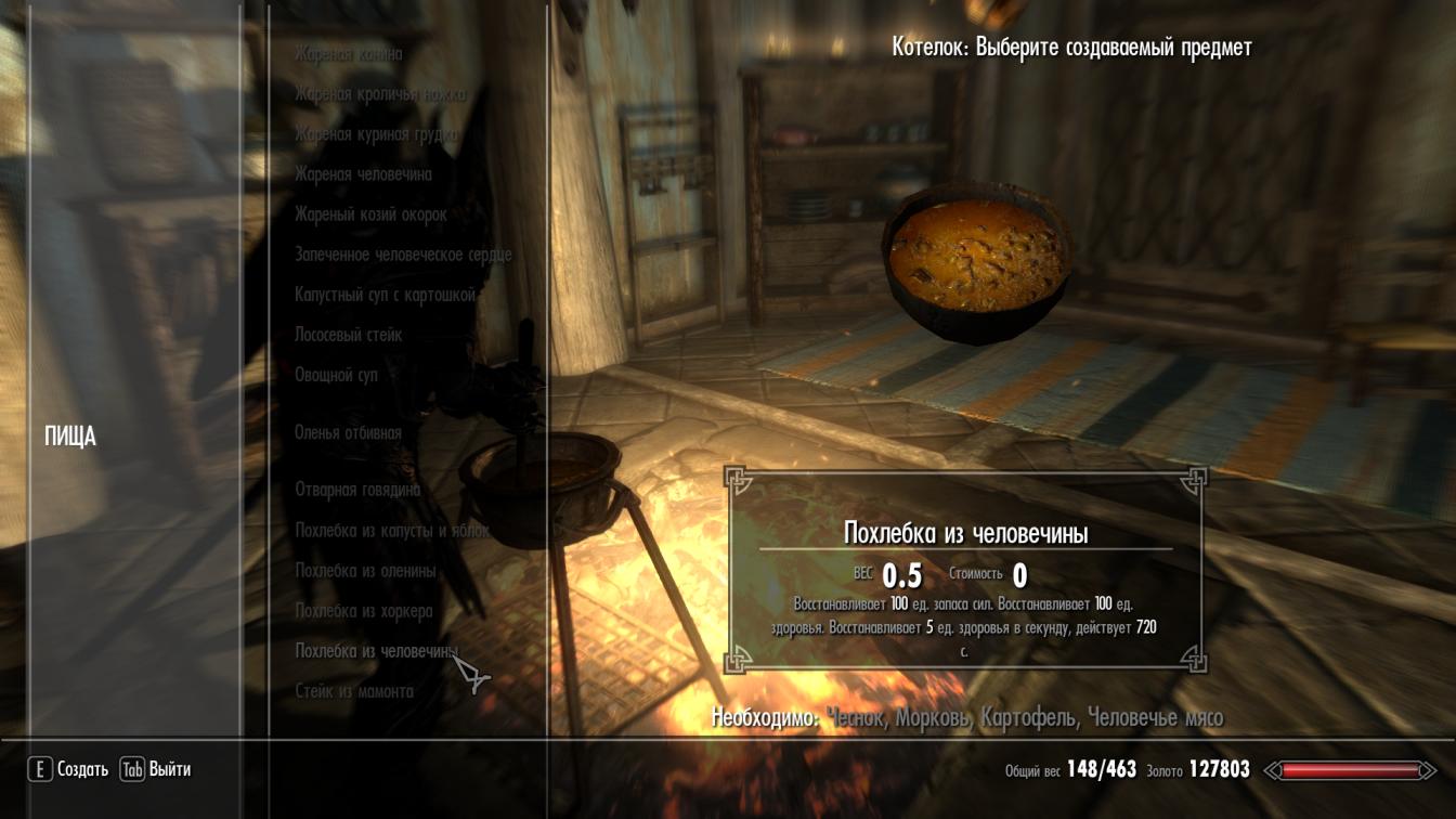Тушеная человечина - лечит 100 ед. здоровья, восстанавливает 100 ед. выносливости, восстанавливает 5 ед. здоровья каждую секунду в течение 720 секунд.