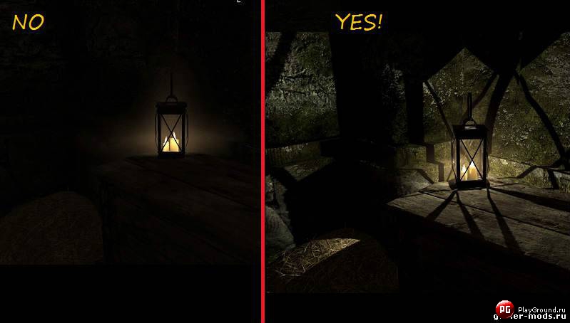 Все заметили что при включённом фонаре на столе,в подземельях и т.д рядом ничего не освещается почему то!!! Хотя свет от фонаря должен освещать окружающее пространство и мы должны видеть что лежит рядом,или что находится в темных уголках куда попадает источник света.В игре этого не сделано! Теперь это исправлено! Смотрите пример стоящего фонаря на столе и фонари на городских стенах до и после изменений,так и должно быть!