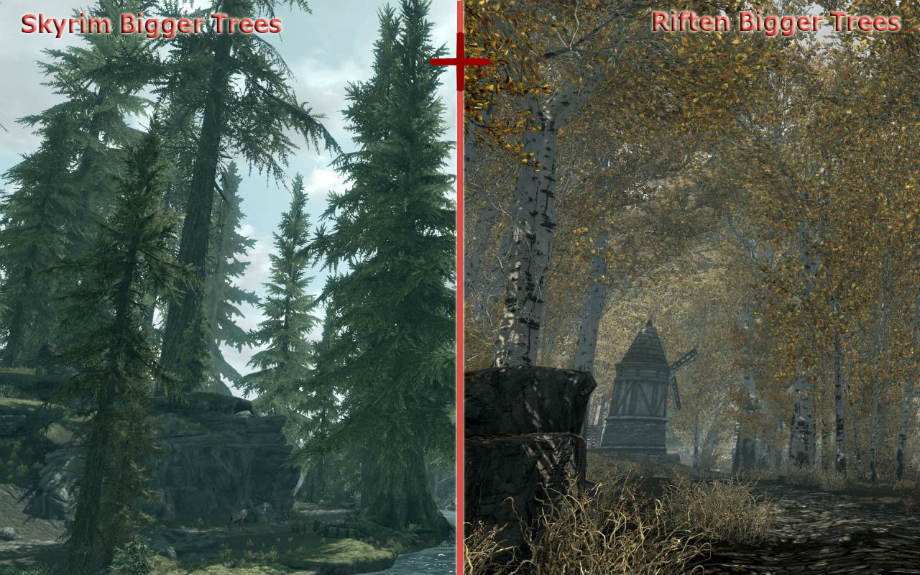 - SkyrimBT + RiftenBT - во всем Скайриме и в области Рифтена будут большие деревья (намного больше игровых)