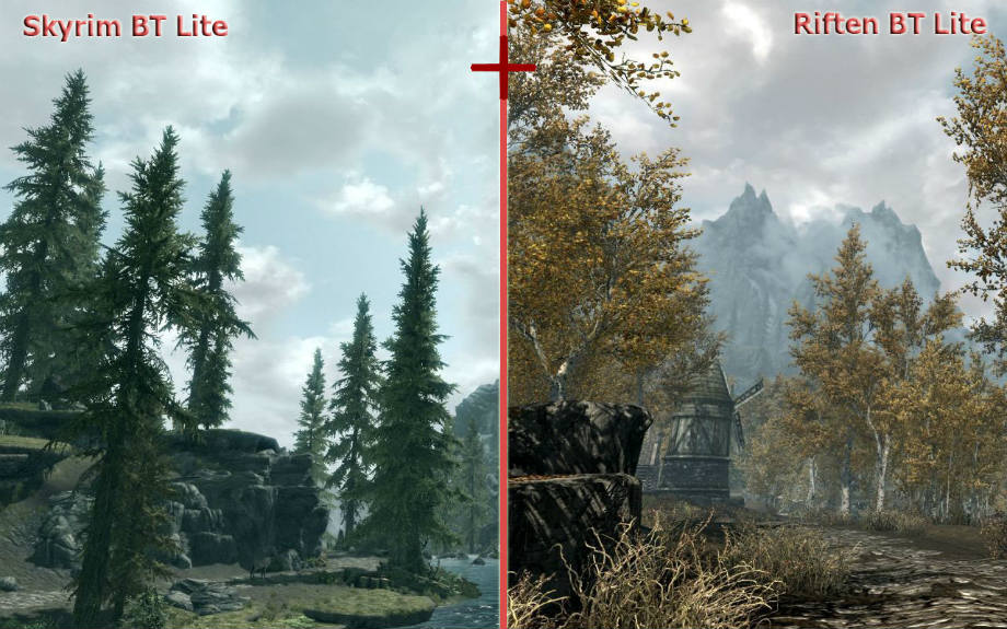 - SkyrimBT Lite + RiftenBT Lite - во всем Скайриме будут маленькие деревья (чуть больше игровых) и в области Рифтена будут маленькие деревья (чуть больше игровых)