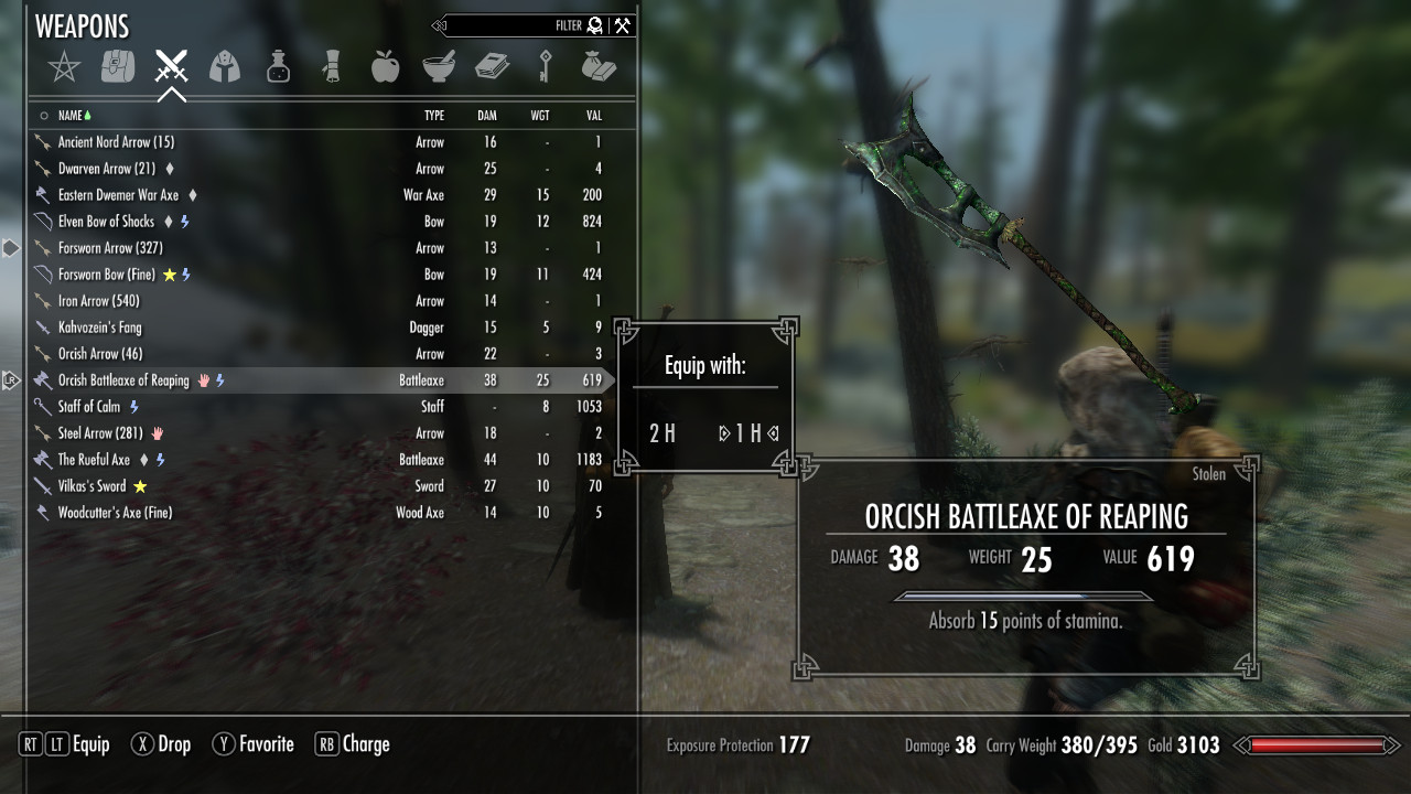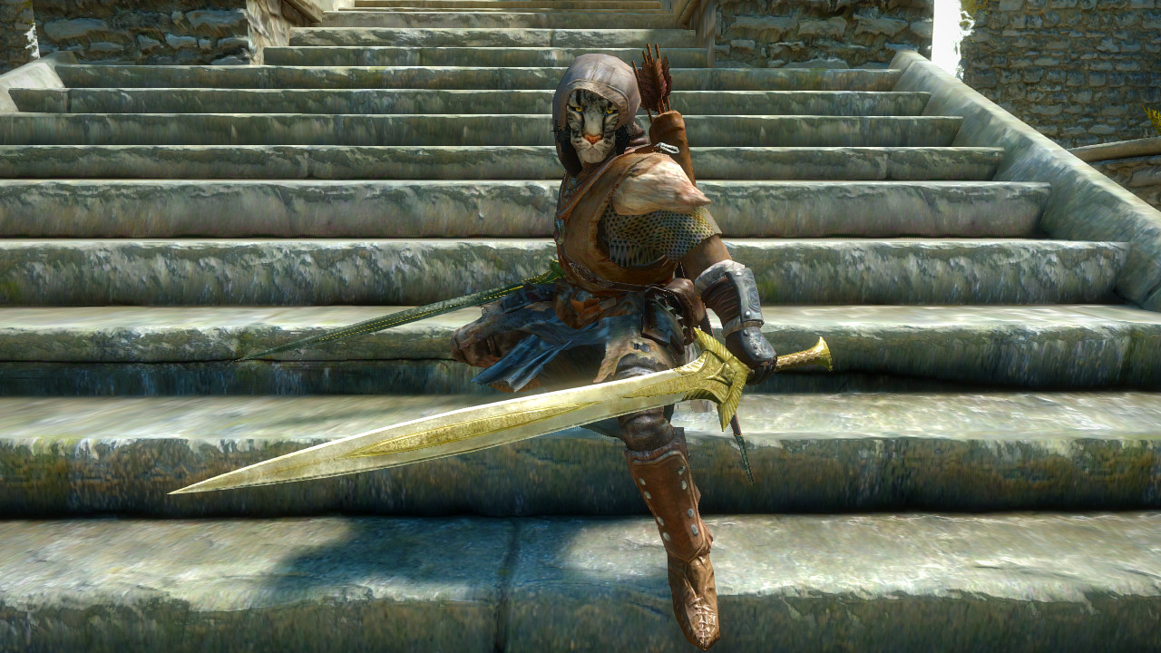 Возможно вы помните самые первые заявления Бесезды? Ну, те самые, про горящие мельницы, динамические цены на муку, династии, где потомок продолжает дела родителей, про возможность взять меч двумя руками? Ну так вот, данный мод дает возможность взять любое одноручное оружие как двуручное и любое двуручное как одноручное. На моих скриншотах (в конце) вы можете увидеть принцип работы на примере деревянного меча и орочьей секиры. Разумеется, посохов и луков/арбалетов это не коснется.
