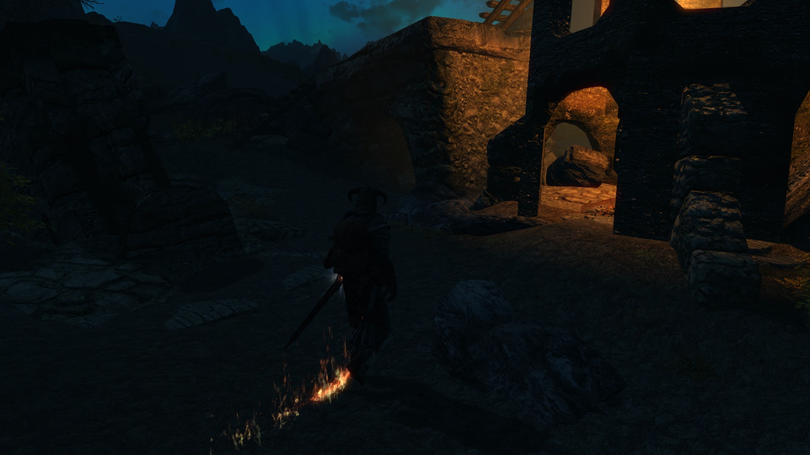 За главным героем идет огненный след скорее всего атронаха, после миссии найти три книги для коллегии Винтерхолда в крепости Феллглоу там как раз финальный файт среди огненных атронахов