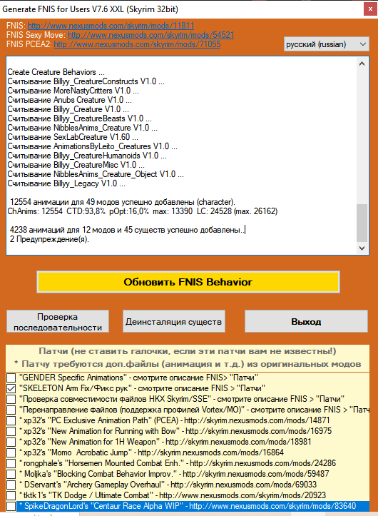 У вас не поставлены некоторые галочки, убедитесь что у вас нет модов которые следует подключить, иначе возникнут ошибки. Ваша версия секслаб должна советовать установленным анимациям иначе они будут неправильно сгенерированы в "биавор". Проверьте не попали ли в ваши анимации, анимации для другой версии игры. Либо устаревшие. Как правило это и является основой ошибкой. Оптимально удалить все старые анимации, заменив их на последнюю версию. После чего все перегенерировать. Еще бывает некоторые моды устанавливают уже готовые "биавор" фалы которые могут не соответствовать текущей версии. Обычно проще всего удалить папку "behaviors" а затем последовательно установить из модов имеющих такую папку, фалы: пока при генерации, вновь не выползет ошибка.