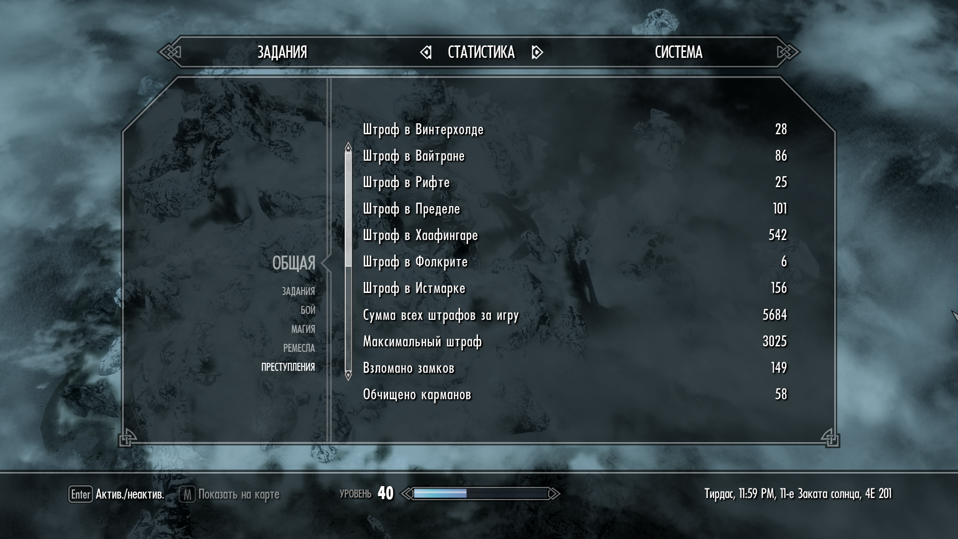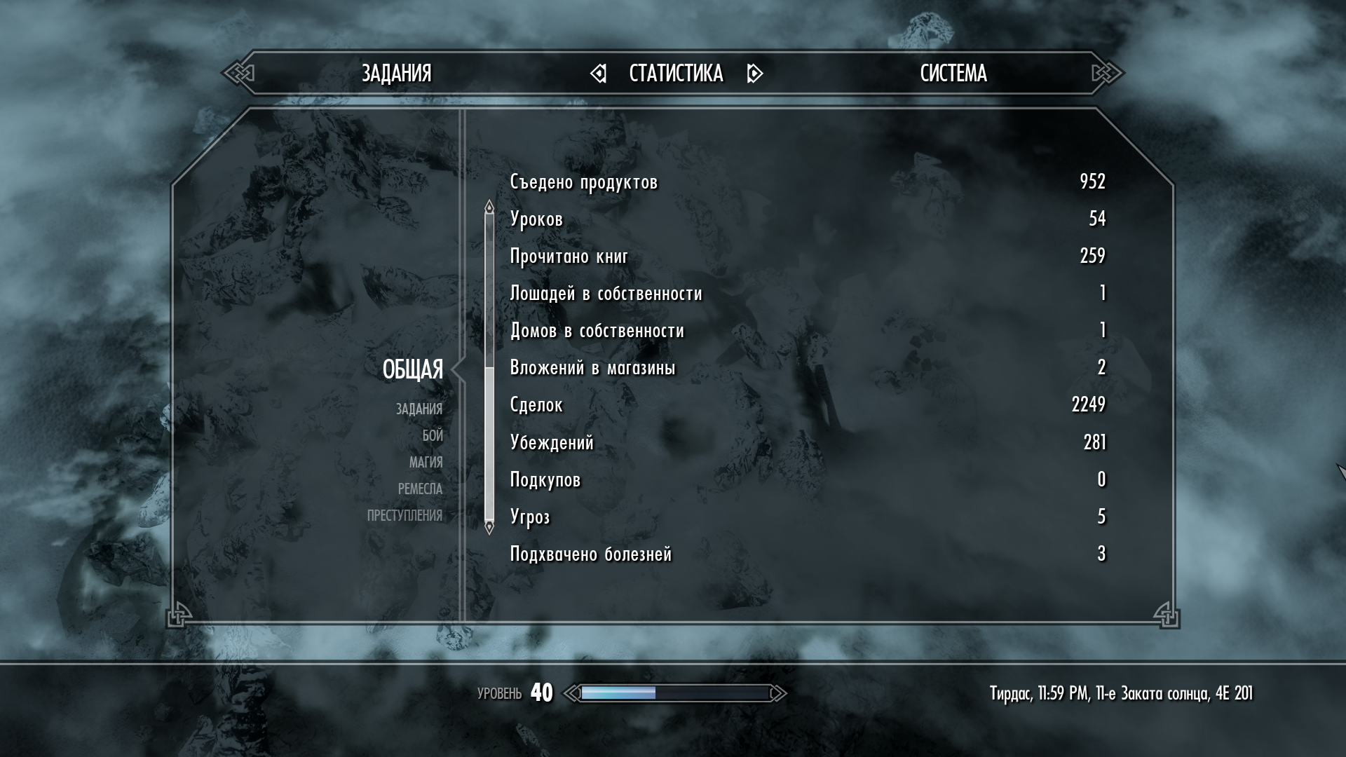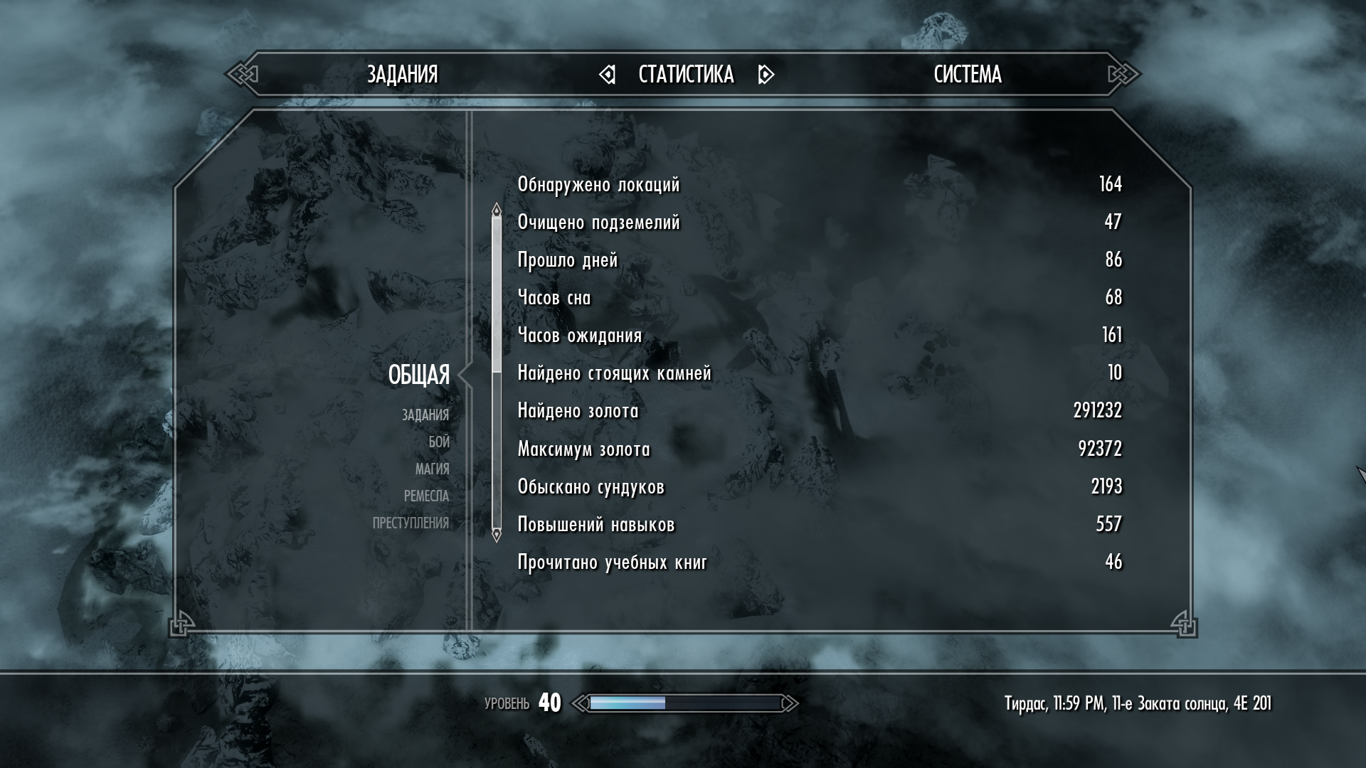 Могу поделиться скриншотами статистики. Steam-версия, Legendary. Уровень 40, 287 часов игры, 40% достижений (30/75). Не уходят под спойлер.