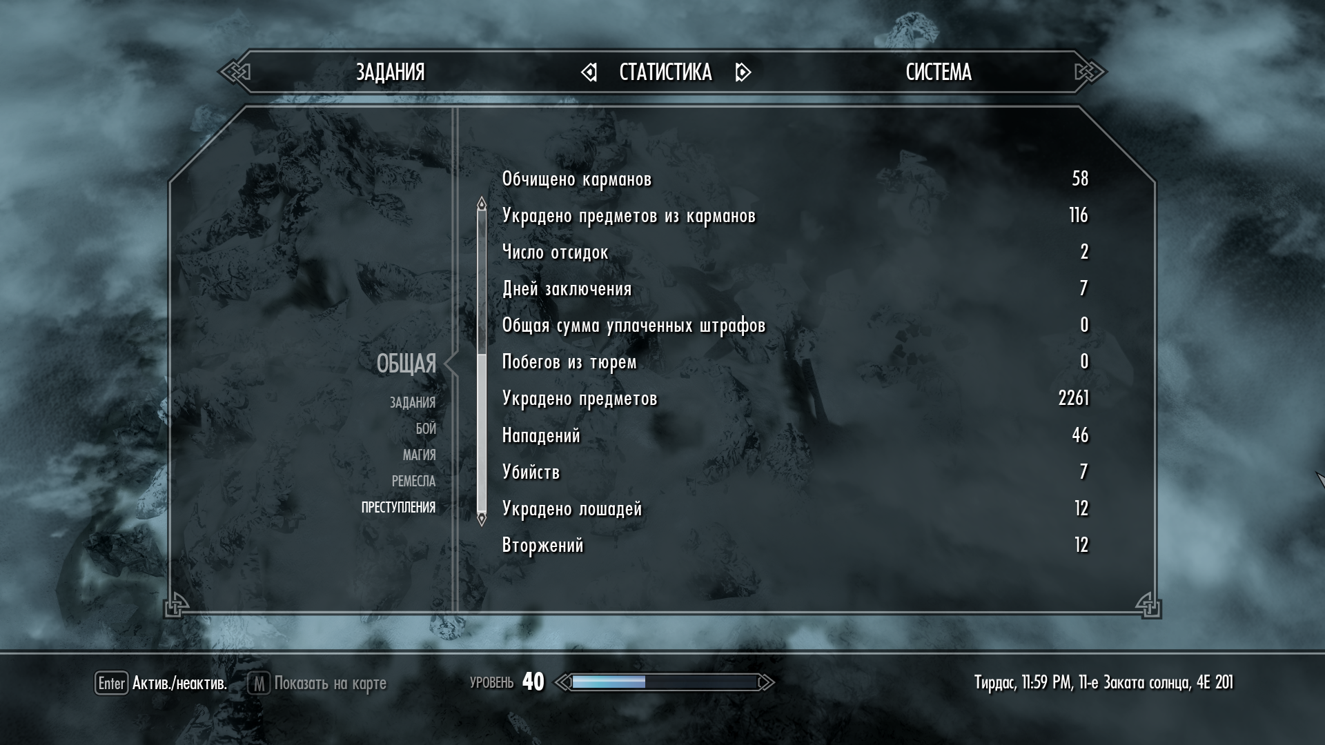 В инвентаре у меня очень много сетов (об инвентаре отдельный разговор, носил 30 тонн, оставил 12), улучшенных на станке до максимальных показателей (Эпические), при этом, огромное количество разнообразных характеристик и зачарований (а если прокачаться, то можно зачаровать и самому по своему желанию, это тоже вариант). Могу облачиться в самые тяжёлые доспехи с максимальной бронёй (в этом всегда и бегал), при этом из оружия - лук и обычные, железные стрелы (благо, лук хотя бы из всего оружия с максимальным уроном, так как прокачал). Либо, могу надеть лёгкие доспехи и одноручное оружие, могу взять двуручное оружие (зачарованное+), могу даэдрические артефакты (оружие), посохи, о щитах отдельный разговор; могу надеть одеяния мага (эксперта и эксперта определённой школы за 4к), члена Культа, Старых богов, Тёмного Братства, Гильдии Воров, Коллегии Магов и остальных. Это я уже не вспоминаю о многотонном количестве стандартных: железных, хитиновых, нордских, костяных, пластинчатых, стеклянных, металлических, имперских, клёпаных, меховых и прочих сетах одежды.