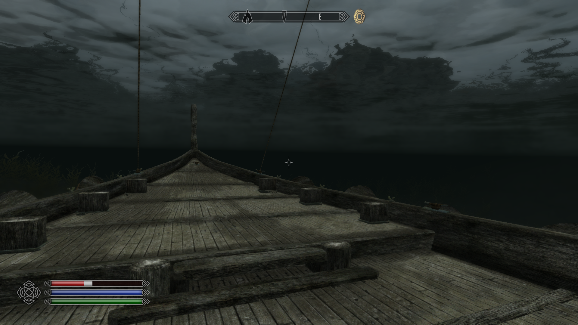 Собственно, при первом посещении острова, запускается сцена вхождения корабля в гавань Вороней Скалы. У меня она угашена об дерево. После загрузочного экрана, "Северная Дева" появляется под водой. И плывёт. Субмарина-кабриолет, мать её... Мой довакин захлёбывается водой. Вот. А ещё, после швартовки (если прописать TGM в консоли, и не утонуть), Мой персонаж появляется рядом, за бортом, под водой. И лишь после этого, начинается реплика капитана Гьялунда, которая должна быть во время подплытия.