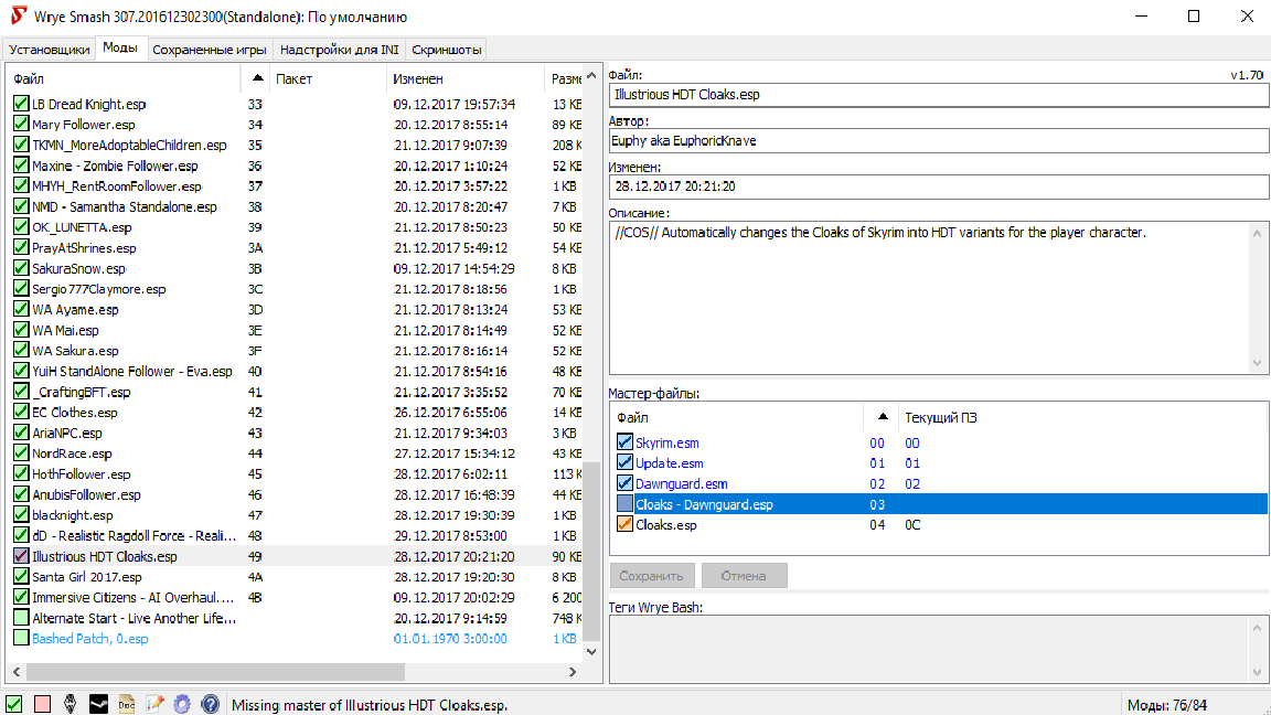 Дело в том что я как и писал выше, что делаю всё по инструкции! Но там НЕТ В ПАПКЕ опционал файла есп cloaks skyrim dawnguard