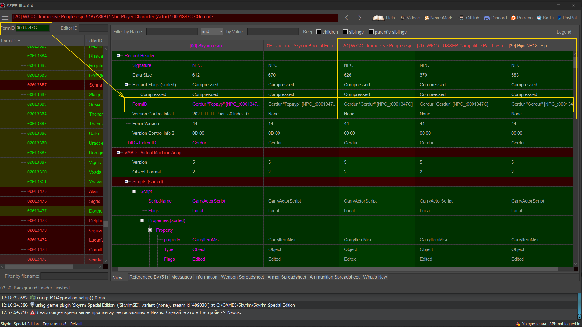 После запуска SSEEdit в левом верхнем углу в поле FormID нужно вставить ID предмета, для факела Torch это будет 0001D4EC, для капусты Cabbage это 00064B3F, жмем на Enter. Таким образом находим какой мод затрагивает названия. ID можно посмотреть здесь: https://elderscrolls.fandom.com/wiki/Torch_(Skyrim)