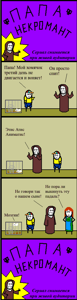 В следующей серии. СЫН:Папа, а почему рыбки плавают так странно. К верху брюхом. ОТЕЦ:Они спят. Читает заклинание. СЫН:Надо покормить рыбок. РЫБКИ:Хрясь, хрясь, хрясь. ОТЕЦ:Вот, блин. Надо воскресить сына, пока жена не вернулась. Надеюсь этой косточки хватит. Фу Бобик, отдай.
