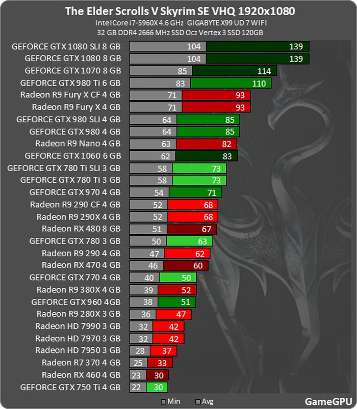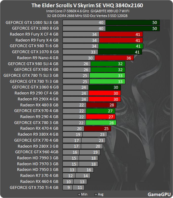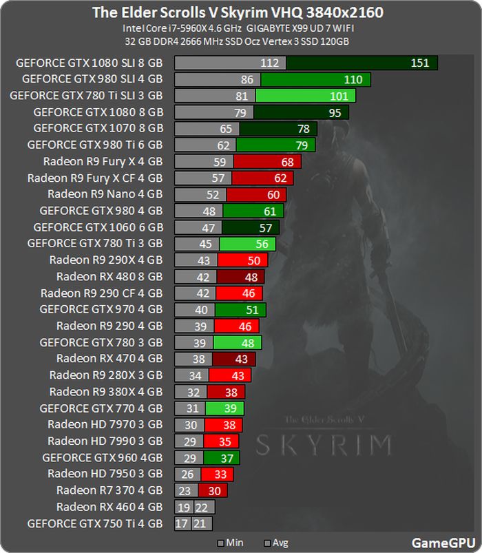 Наши видеокарты тестировались при разрешениях 1920х1080, 2560х1600 и 3840х2160 при максимальных настройках качества графики в оригинале и ремастере 2016 года. SLI в игре 2011 года поддерживается, а вот AMD CrossFireX к удмвлению немного уходит в минус. В The Elder Scrolls V: Skyrim Special Edition ни SLI, ни AMD CrossFireX не работают.