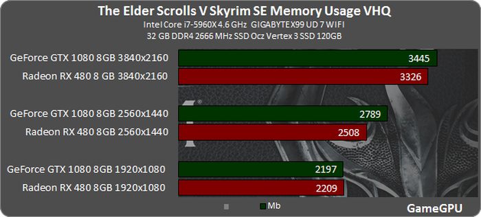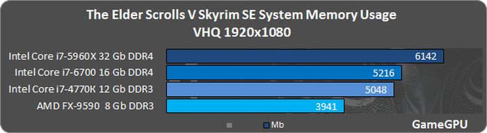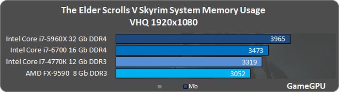 При наличии системы с 8 гигабайтам Skyrim потреблял 3 гигабайта ОЗУ. При наличии системы с 12-ти гигабайтами потребление ОЗУ всей оперативной памяти составило 3.3 гигабайта. С системой на 16 гигабайт потребление общей памяти составило почти 3.4 гигабайта. И при наличии 32 гигабайт оперативной памяти система потребляет 4 гигабайта ОЗУ.