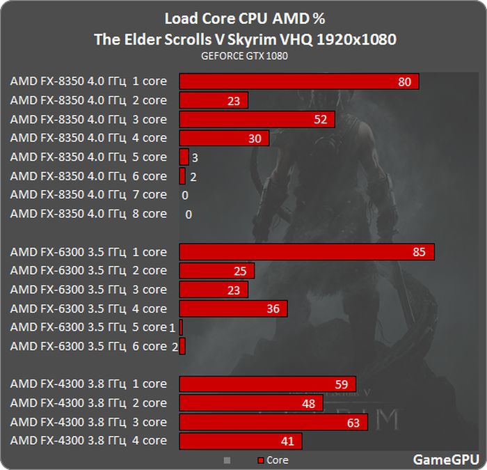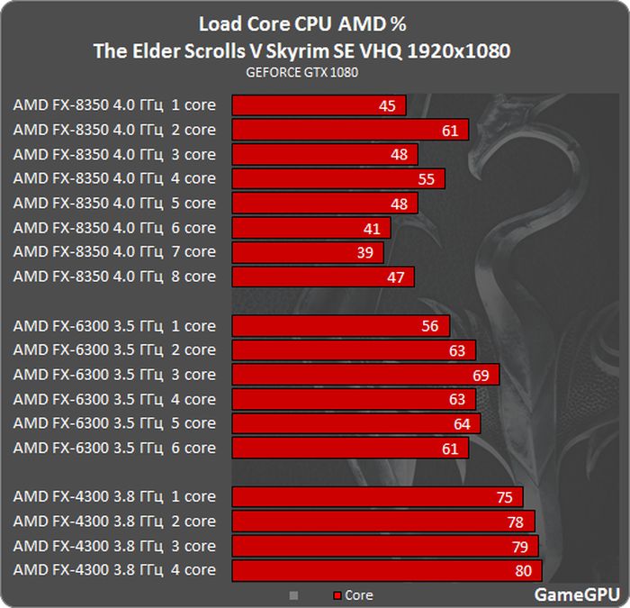 Загрузка процессорных ядер при максимальных настройках качества 1920х1080 AMD % Skyrim