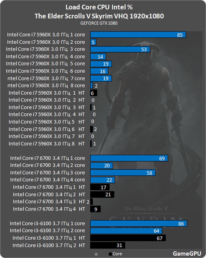 Загрузка процессорных ядер при максимальных настройках качества 1920х1080 Intel % Skyrim: Special Edition