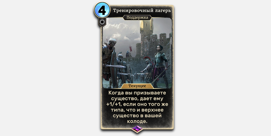 «Тренировочный лагерь» – это нейтральная карта поддержки с постоянно действующим эффектом, которая усиливает разыгрываемое существо, если его тип совпадает с типом верхнего существа в вашей колоде. Этот эффект обладает долей случайности, но умелый игрок может свести ее к минимуму, соответственно собрав колоду.