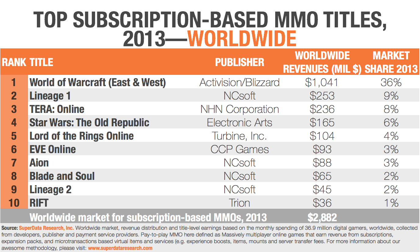 В соответствии с отчетом компании, рынок ММО-игр, использующих схему «pay-to-play», сокращался с 2010 года, что выразилось в сокращении объема общей ежемесячной платной подписки с $30,6 миллиона до $23,4 миллиона в 2014 году. Сам рынок сократился до $2,9 миллиарда, а на одного пользователя приходится в среднем $170.