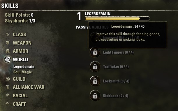 Продажа украденных вещей повышает прогресс ветки “Legerdemain” ("бродяга" или "плут"). Но скупают краденое определённые персонажи в специально отведенных местах. Кроме того, за сутки можно продать им ограниченное количество сворованных вещей. Бездумно заниматься этим нет смысла, но каждый игрок для себя решит, как он будет отыгрывать персонажем. Повторюсь, это MMO, но никто не запрещает исследовать Тамриэль в одиночку полностью любым удобным способом, забив на всякие мультиплеерные элементы.