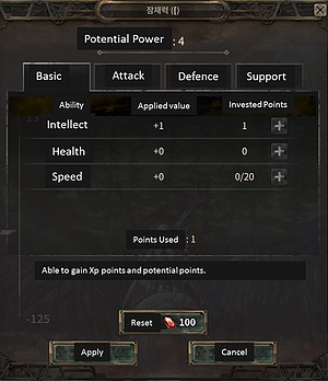«Потенциальная сила» - это система типов уровней, в которой уровни получаются через XP за убийства мобов и выполнение заданий, и когда вы получаете определенный уровень «Потенциальной силы», вы получаете очко способностей, которое можно распределить по своему желанию, используя интерфейс ниже. В отличие от стандартного уровня, характеристики не меняются каждый уровень, и у вас есть возможность самим выбирать, какие хар-ки персонажа увеличивать с помощью очков способностей, получаемых за «Уровни потенциальной силы».