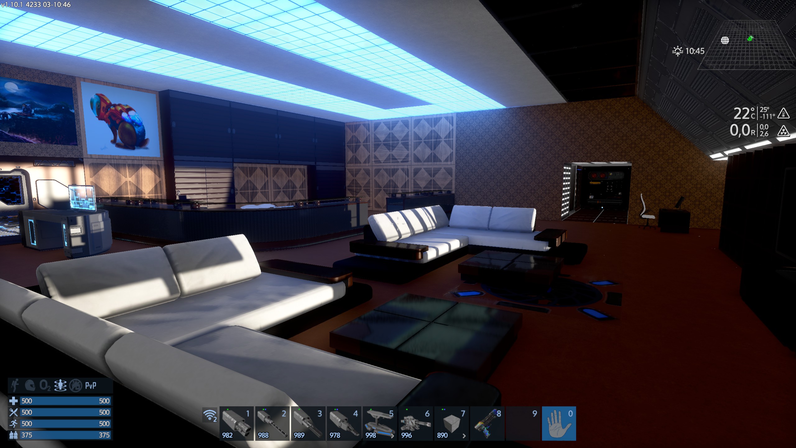В наличии 2 комфортные каюты, ремонтный модуль, мед-отсек, смотровая палуба, ресторан, машинное отделение, мастерская, исследовательская, казармы, гидропоника.