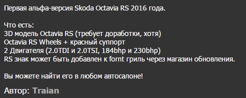 SkillSlik Ну вот Газель есть http://sharemods.com/fb5tb44oeobb/gazell-business-125.zip.html продаётся в Вольво, Есть ещё Нива,но она приват(продается,в свободном доступе её нет) А так вроде насколько я знаю больше из легковых отечественных нет модов