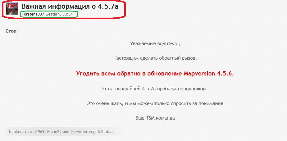 Важная информация по карте - TruckSim Map 4.5.7a. Как было мною выше постами отмечено - официальной ссылки на переделанную карту - НЕТ! Информация от Команды TSM! Просят остерегаться подделок и нелегальных изданий карты - Map 4.6.х Судя по всему у команды TSM, на данный момент существует дилемма, продолжать ли работать над картой для версии - 1.8.2.5s или бросить все свои силы на окончание строительства карты - TruckSim Map 4.6.х для версии игры - 1.9.х которая вот, вот должна появится.на ОфСайте ETS2