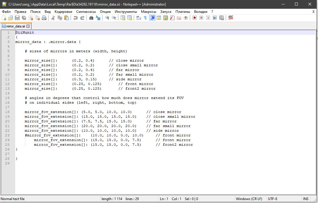 Serg_BSV Чтобы вылета не было при подключении левого капотного зеркала. то нужно в файлике "mirror_data.sii" прописать следующие параметры; mirror_size[]: (0.25, 0.125) // front2 mirror и вот этот параметр; mirror_fov_extension[]: (15.0, 15.0, 0.0, 7.5) // front2 mirror. Там эти параметры есть, просто для левого капотного зеркала нужно 2 дописать, после этого слова "front" Как выше уже показал. То есть параметры эти копируем и вставляем а потом после "front" дописываем 2 ""front2" Вот как на скрине