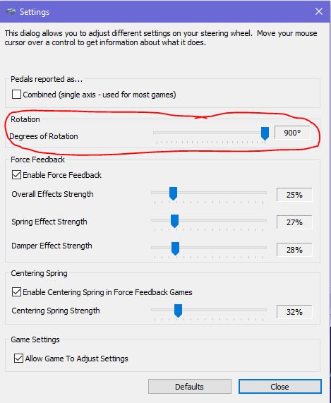 Тогда, к сожалению, вряд ли смогу помочь. У меня тоже стоит Windows 10 64-bit и игру запускаю 64-битную - руль крутится на 900 градусов. Если не пробовал, попробуй выбрать правой кнопкой на Logitech Profiler раздел Game Controllers, в открывшимся окне "свойства", потом кнопку "Settings".