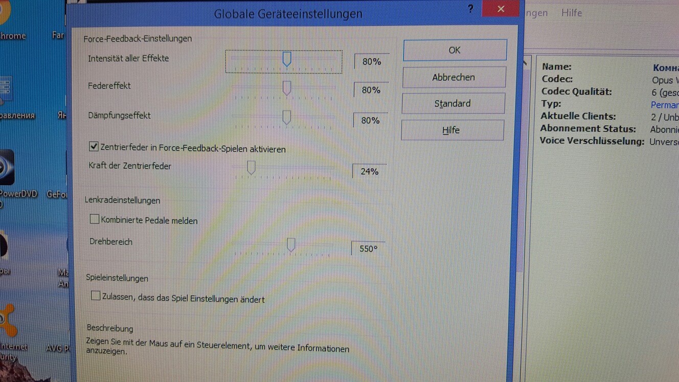 Открываем Logitech Profiler, далее жмём на вкладку Options -> Global Device Settings, тут верхние три ползунка должны быть выставлены все на 100% (вязкость руля и силу возврата руля в начальное положение с увеличением скорости можно настроить в самой игре). Самый последний (нижний) ползунок должен быть выставлен на все 900 градусов - это полтора оборота руля в каждую сторону - максимальное, которое поддерживают все рули фирмы Logitech, начиная от DFGT. В самом низу должна стоять галочка напротив Allow Game to Adjust Settings. Всё остальное не трогаем.