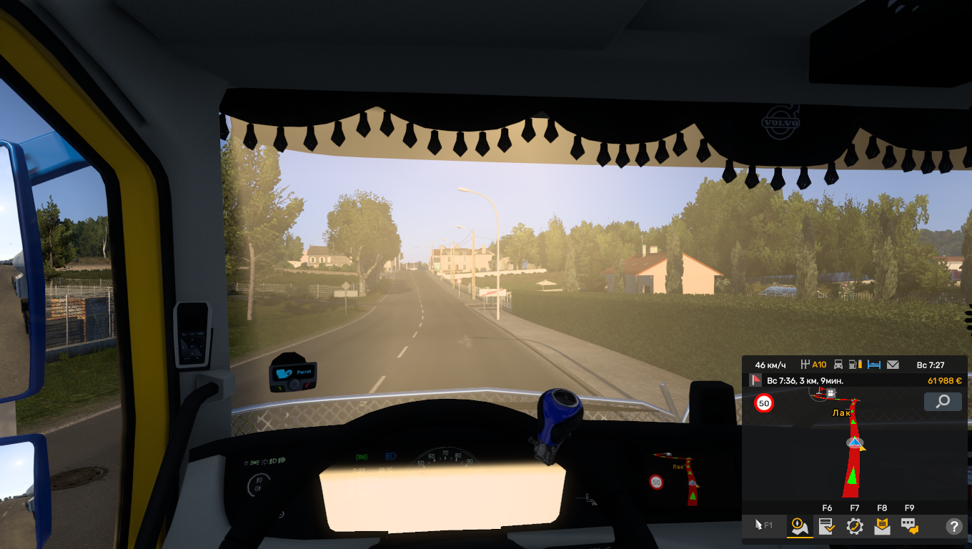 На грузовики тоже нет модов, у меня только на тюнинг моды на внешний, зеркала синие только вот модовские на скрине, разные цвета кастомные на "ванильные" зеркала (хочу потом черный скин сделать и синие зеркала к нему, как в "крепком орешке", коплю вот деньги, чтобы прокачать капитально) и кабина прокачена визуально, не более, ну еще пару модов на прицепы, но прицеп еще не покупал даже, там везу просто цистерну с дизелем.