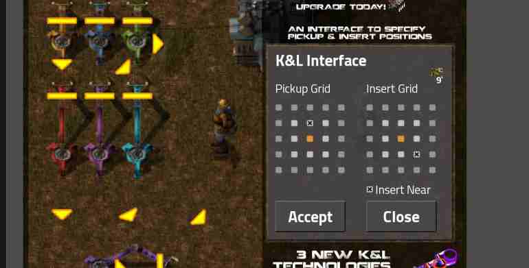 Мод K&L Inserters для factorio 0.12.26 — добавляет настраиваемые манипуляторы, которые могут перемещать предмет из любого места вокруг себя в любое место вокруг себя. Такие манипуляторы упрощают вам жизнь при плотных застройках.
