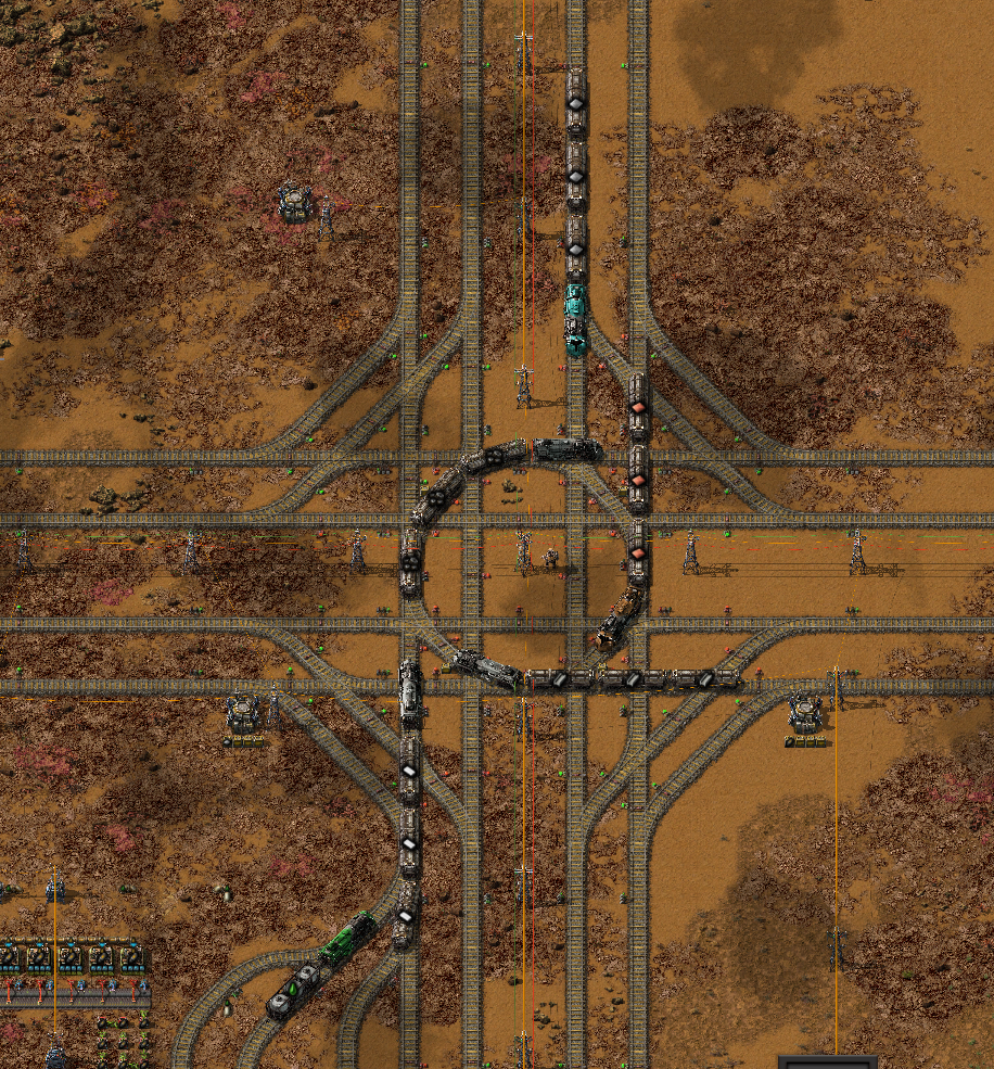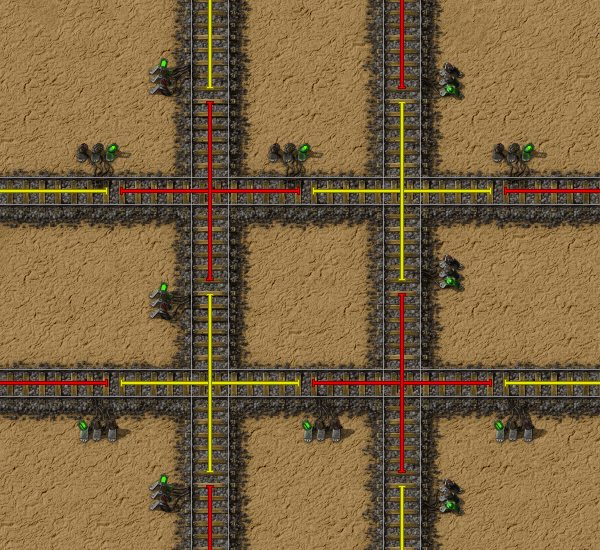 По сути центральный круг сейчас разбит на 4 сегмента, что разрешает заехать более 2 составам и создать пробку. И замена 4х светофоров на проходные верно, тогда центральный круг будет разрешен для прохода только 1 состава поочередно.
