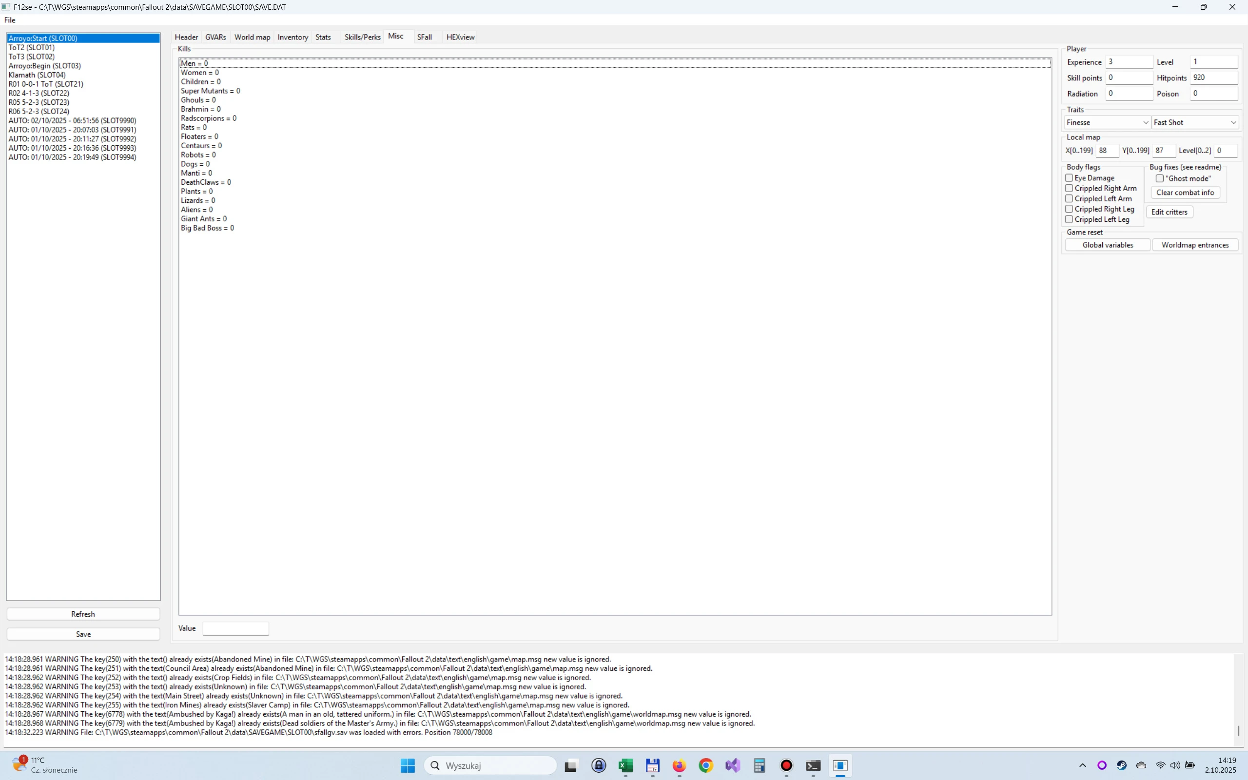 - Создание новых предметов очень рискованно, так как формат данных частично неизвестен, а также созданные предметы не будут иметь прикрепленных скриптов (например, книга подсказок Fallout 2 не будет работать).