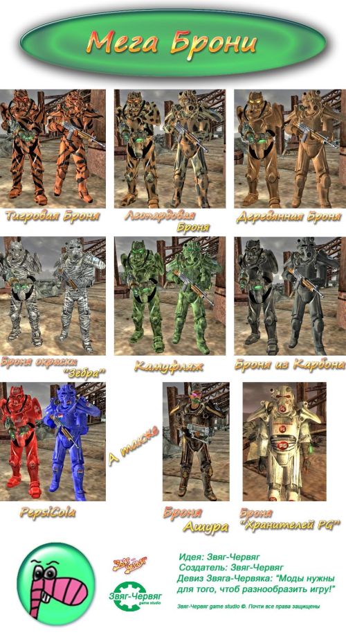 Привет всем!Вам не наскучили однообразные скучные брони Братства и Анклава?Если да, то этот мод для вас!16(!)разновидновидностей ярких, красочных, не на что не похожих боевых броней разнообразят вашу игру!Импровизируйте,создавайте яркие образы из уже готовых материалов.Вы можете выбрать любую, понравившуюся