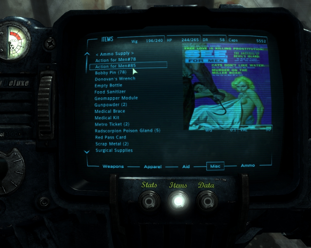 Описание: В локации и мир Столичной Пустоши добавляются около двухсот красочных приключенческих журналов стилистики 40-50-х годов. Таким образом, появляется новый стимул к исследованию игрового мира. Журналы находятся в различных локациях Пустоши, опасных и не очень и отлично вписываются в антураж Фола. Каждый номер имеет свою уникальную обложку, которая отображается в вашем Пип-бое. Как здорово собрать свою неповторимую коллекцию, чтобы потом любоваться ею холодными вечерами, когда за окном бушуют порывы радиоактивного ветра, а дикие гули воют на луну.