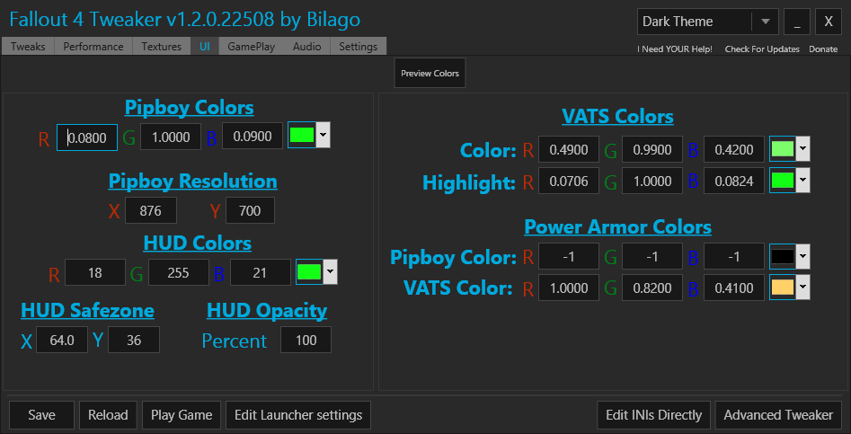 Dropped the Pipboy/vats color tab as the settings in game are easier to use