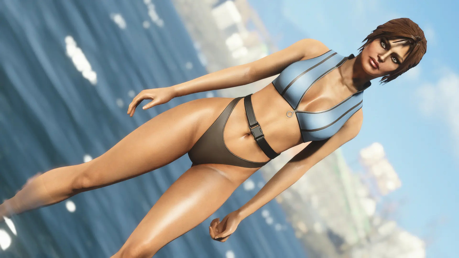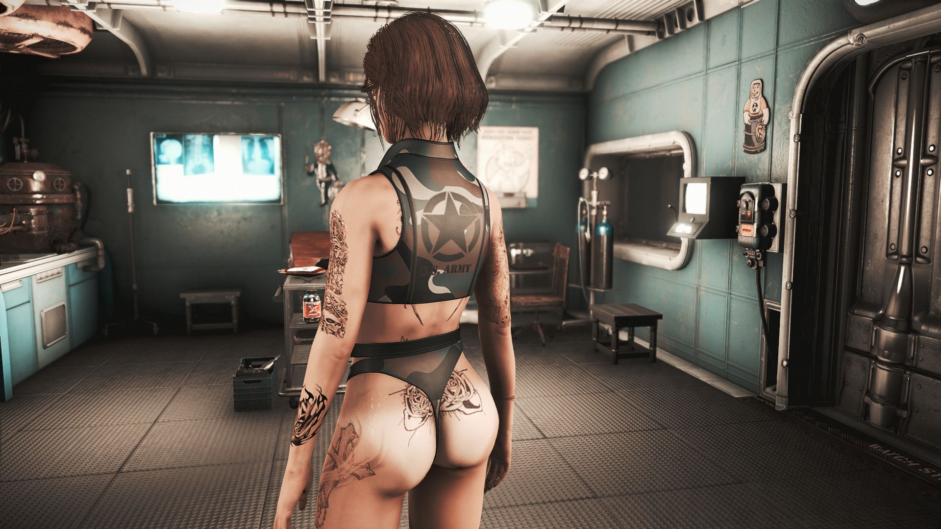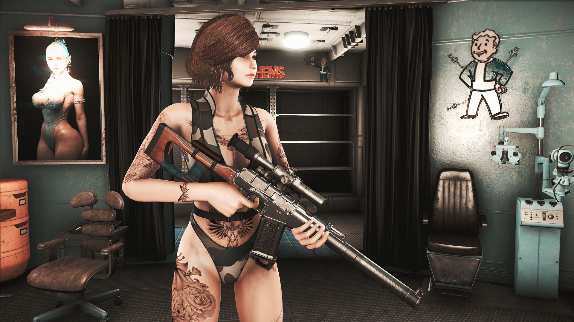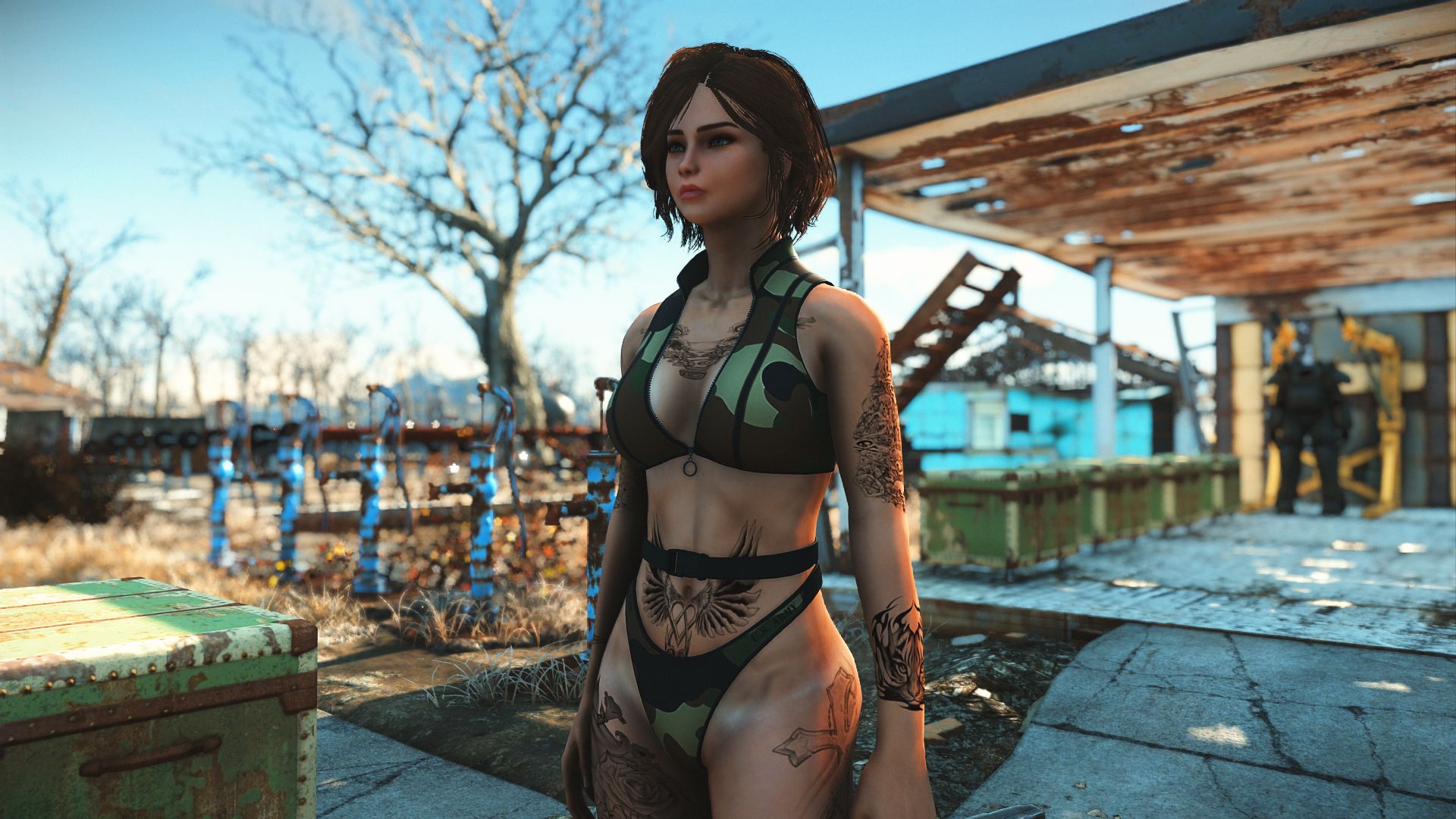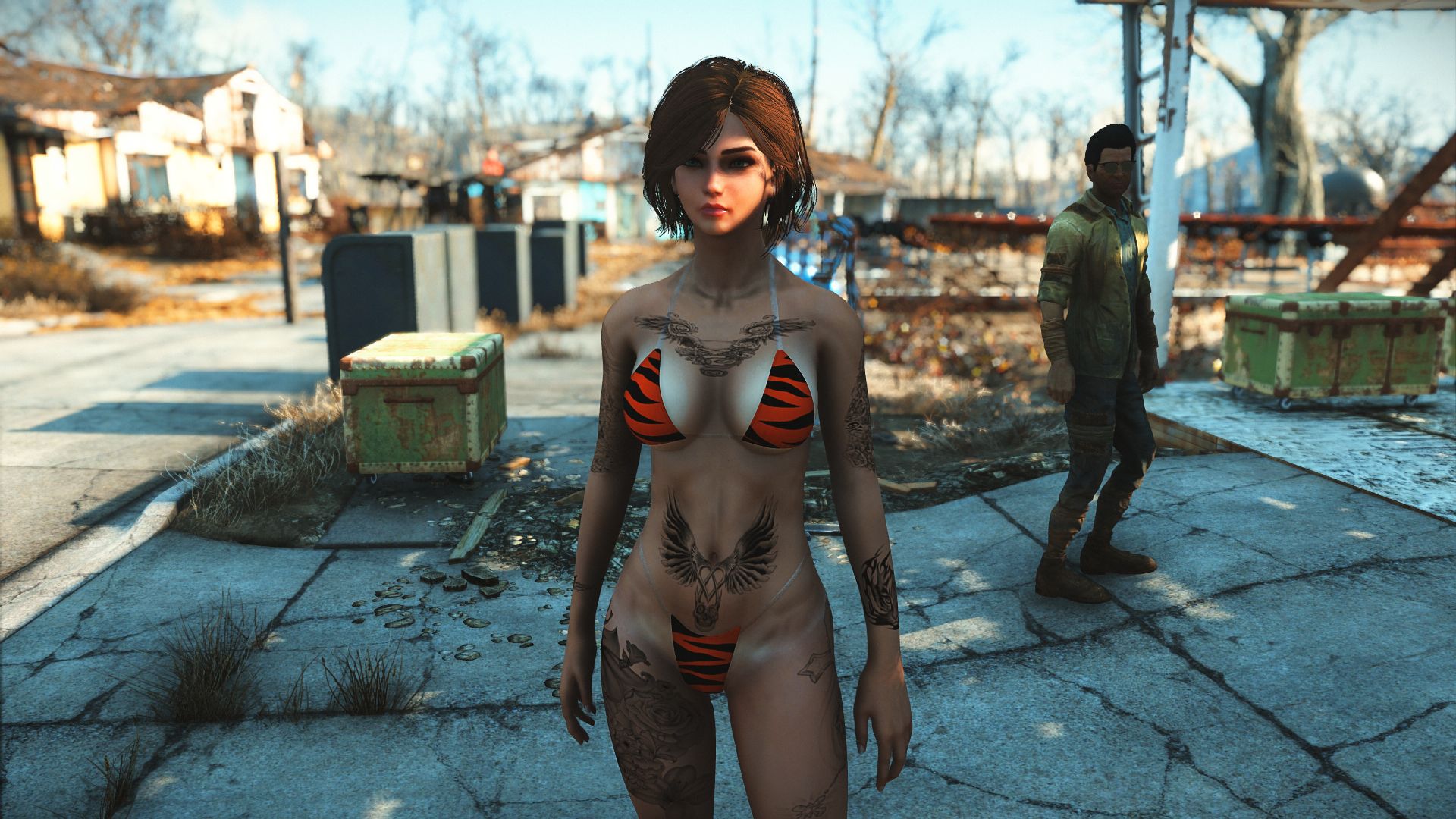 Модификация добавляет огромную коллекцию сексуальны купальников. Пятьдесят девять уникальных купальников, которые можно носить как нижнее белье. Пять дизайнов можно создать на химической станции в категории «Коллекция бикини DX». Вы можете изменить их внешний вид на верстаке для брони. Их можно улучшить на верстаке по изготовлению брони с помощью специальной баллистической ткани, для которой не требуется специальный перк, купальники дают +2 к Харизме.
