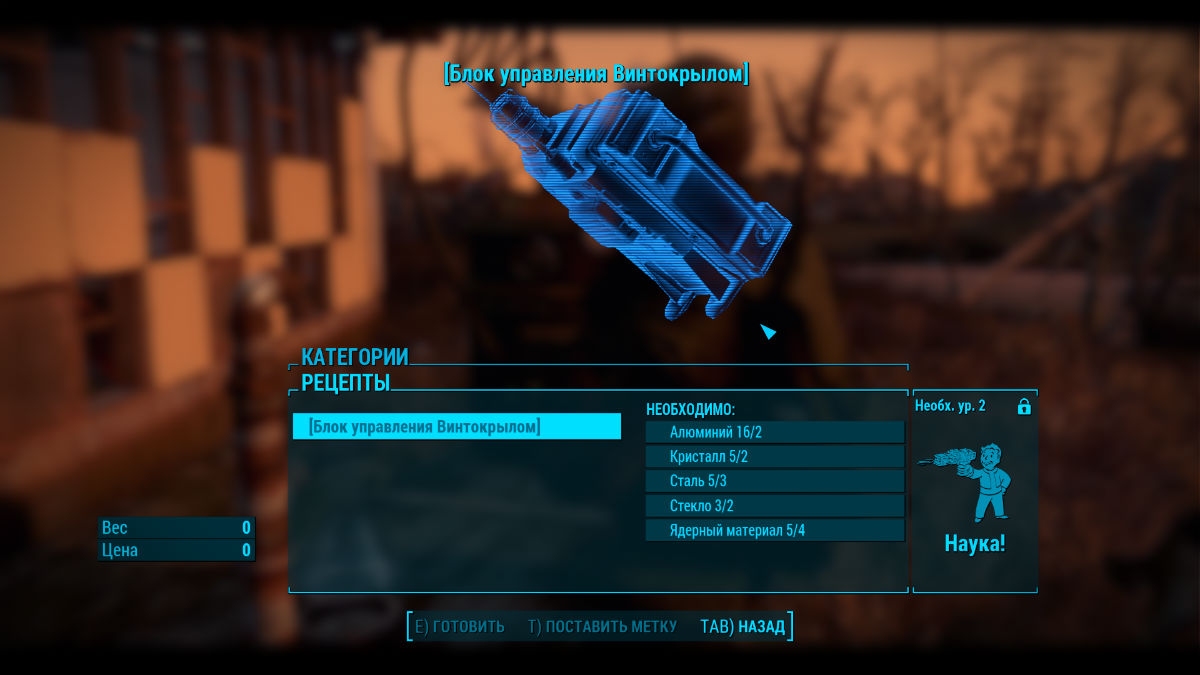 - Прежде всего, нужно создать Блок управления Винтокрылом на Химическом верстаке. Далее уже все сами поймете.
