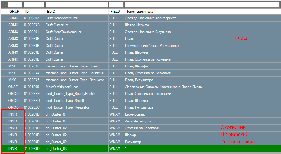 просто группа INNR переводится как прилагательное, а не существительное. из них потом и составляются словосочетания типа Снайперский Взвинченный Продвинутый пистолет. в твоём случае примерно так: Охотничий Регуляторский Шерифский плащ. вот глянь на скрин: