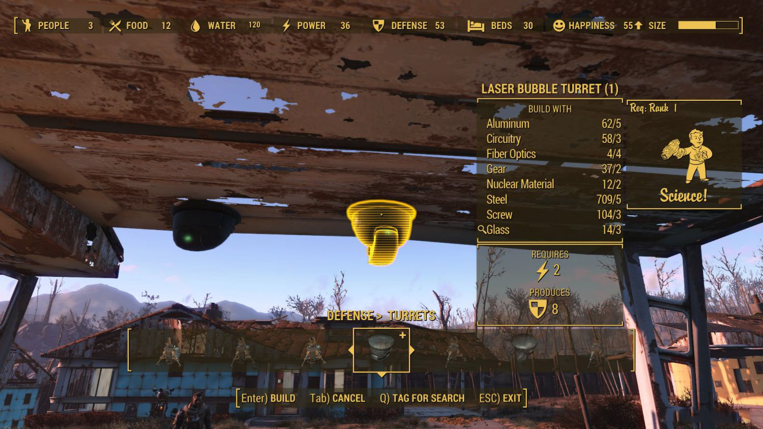 Добавляет в Fallout 4 несколько видов турели "пузырь", которая устанавливается на потолок. Простая, лазерная и вариант "пулемёт" доступен в любой мастерской любого поселения.