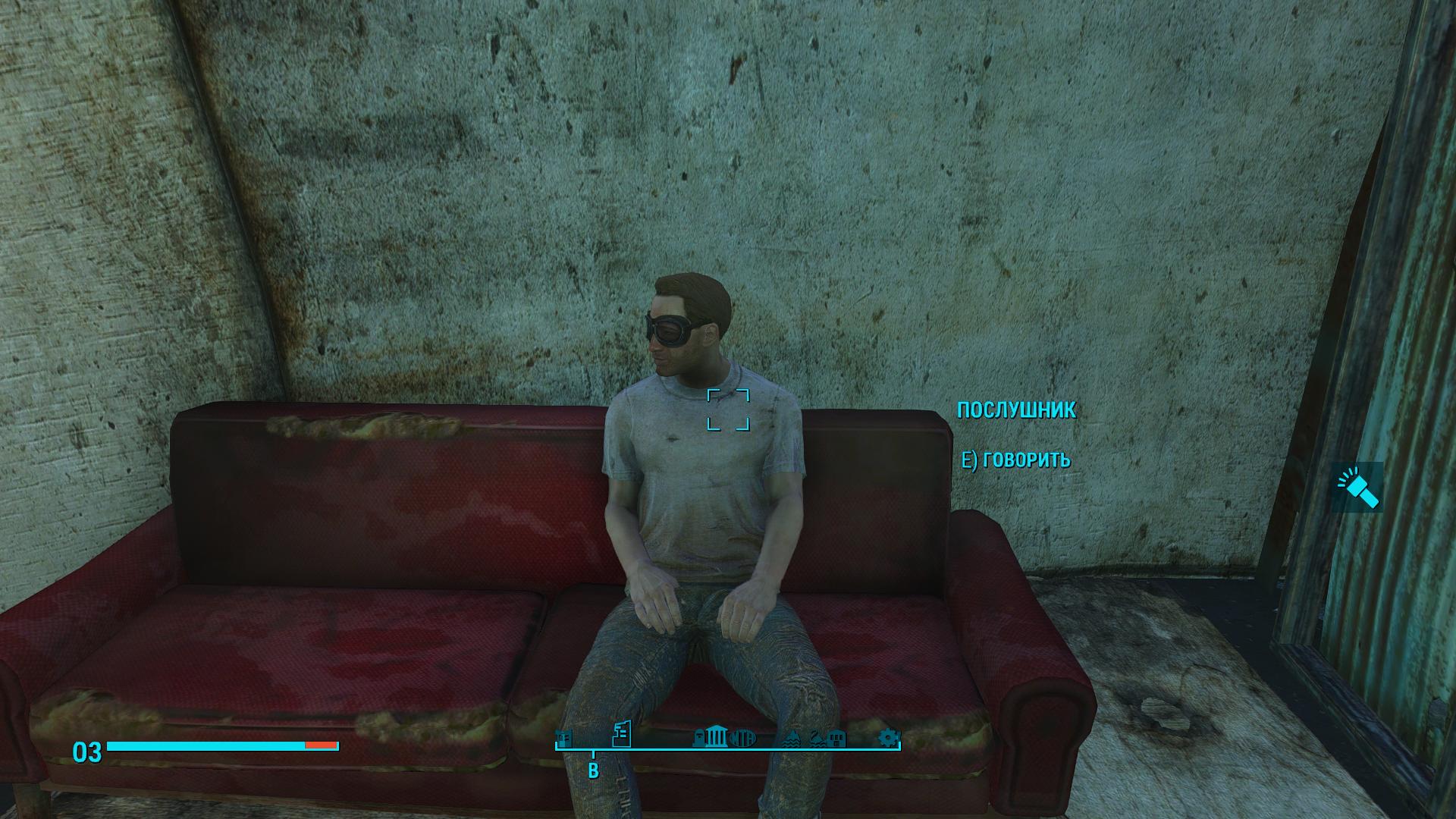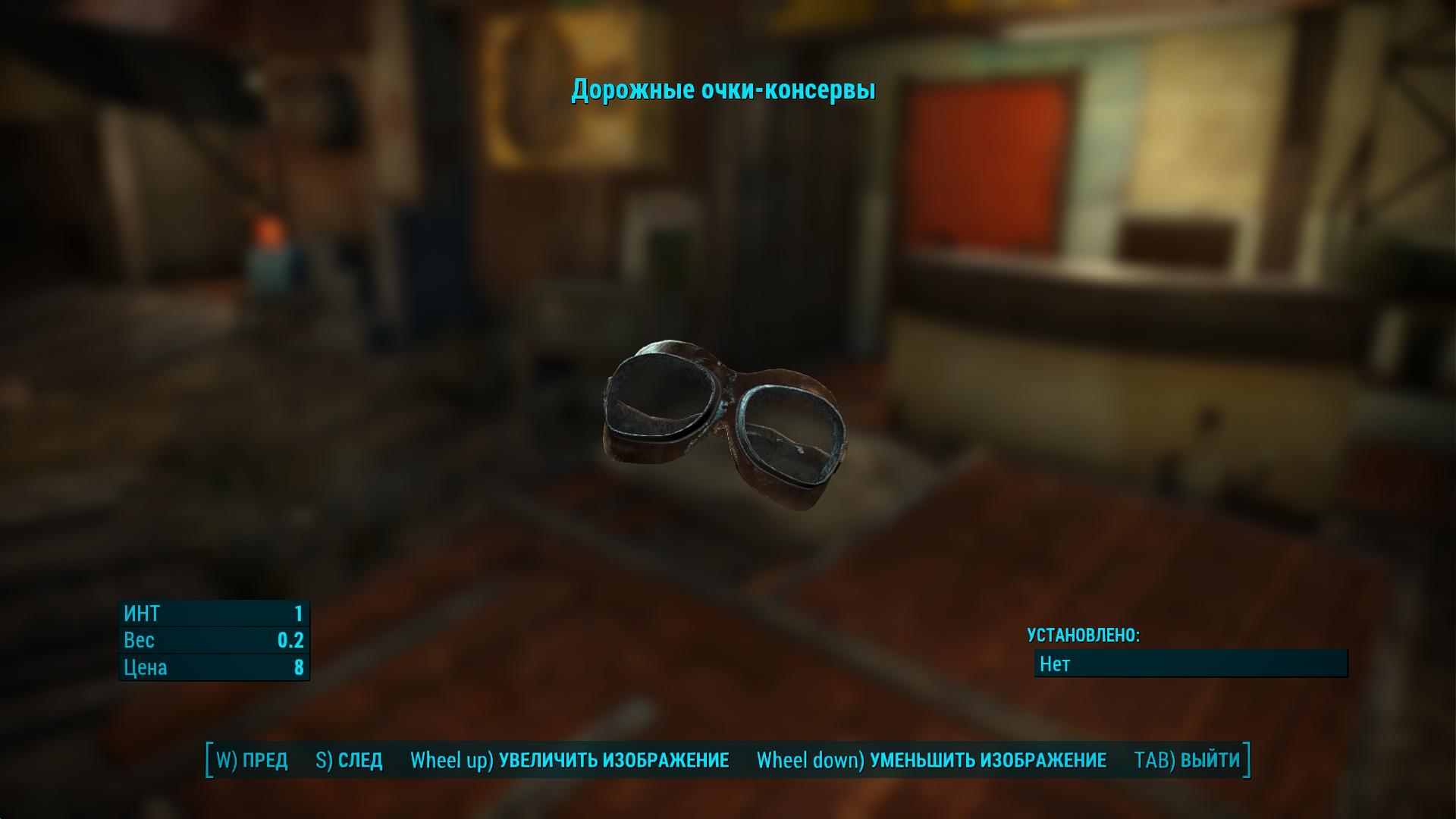 Следующая часть экипировки,это Дорожные очки-консервы (не путать с просто очки-консервы,так они похожи,но прибавляют +1 к восприятию) а нам нужно +1 к интеллекту.Получить эти очки довольно проблематично,так как купить или найти их нельзя,спаунятся они только в одном месте,локация Театр Чарльз-Вью.При чём спаунятся они только на НПС и абсолютно рендомно,нет ни какой гарантии что при перемещении в эту локацию на НПС появятся эти очки.