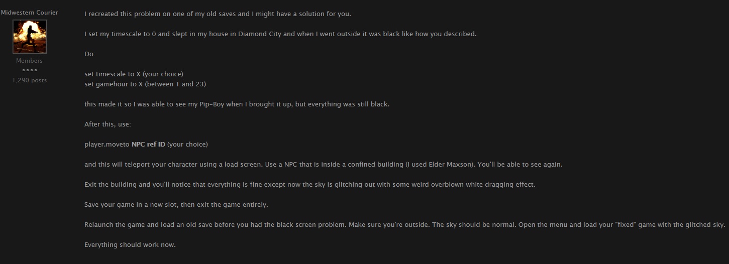 Доброго времени суток, помогите решить проблему. После того, как поспал на кровати все почернело. Виден интерфейс, прицел и т.п. и карта вращается и в меню все ок. Но не видно ничего. Кромешная 100% черная ночь. Можно бегать, натыкаться на предметы, нарываться на врагов, но ничего не видно. В консоли незадолго до этого "сна" прописывал "set timescale to 0", чтобы день дольше был. И да, он стал длиннее, но потом поспал и вот.... Если загружаю предыдущие сейвы, они тоже становятся черными. Перезапуск не помогает, "timescale" тоже вернул в дефаулт к 16. Бесполезно. Помогиииите!!!!