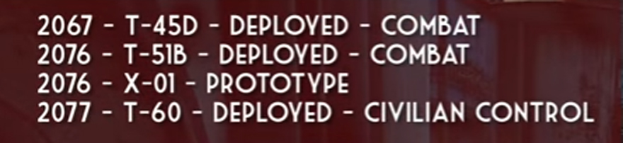 Что касается силовой брони X-01, то она даже внешне имеет отличия от оригинальной advanced power armor. Это явно первичная модель в армии США, которая уже после пошла в ход на территории Калифорнии, Невады и была модернизирована Анклавом, а на территории Массачусетса так и осталась первоначальная модель X. Где X скорее всего обозначает eXperimental, что говорит как о первой разработке самой превосходной силовой броне, по сравнению с довоенными моделями.