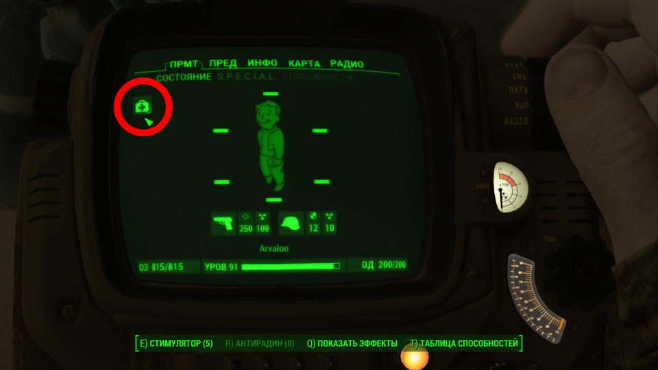 Решил поиграть потяжелее, с сообщениями и значками необходимости пить, есть и спать, а так же их последствиями разобрался. Но не могу понять что с персонажем в случае знака, которую я бы описал "саквояж с медикаментами". ОД и ОЗ вроде не уменьшены, характеристики S.P.E.C.I.A.L тоже без минусов. Какое лекарство надо принять или что подлечить?