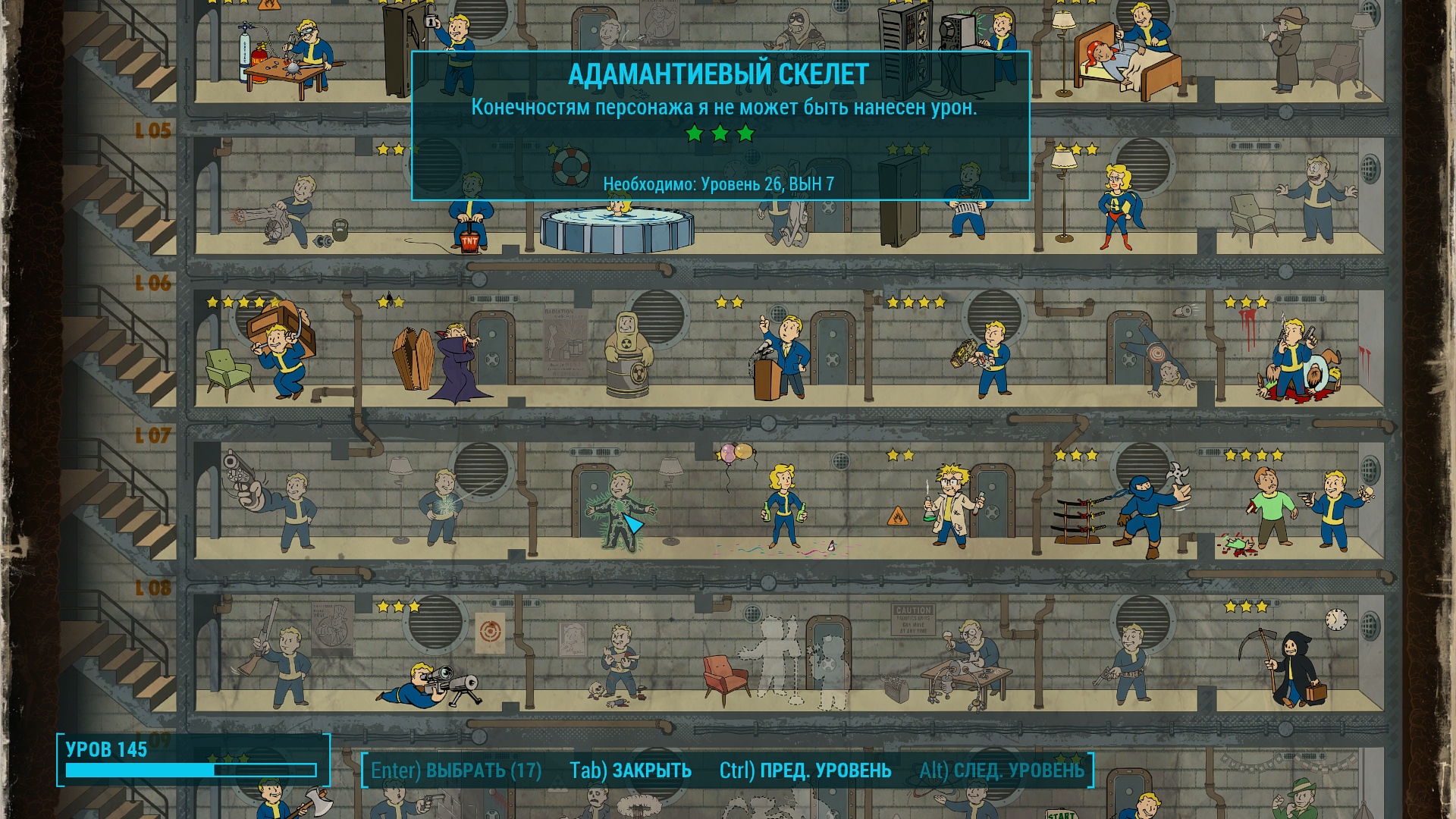 И какое же было моё удивление что при взятии на выживании вроде бы бесполезного перка крепкий хребет четвёртого уровня (он позволяет использовать быстрое перемещение при перегрузе,но на вживании у нас просто нет быстрого перемещения),так вот это перк оказывается ещё и не позволяет конечностям повреждаться.
