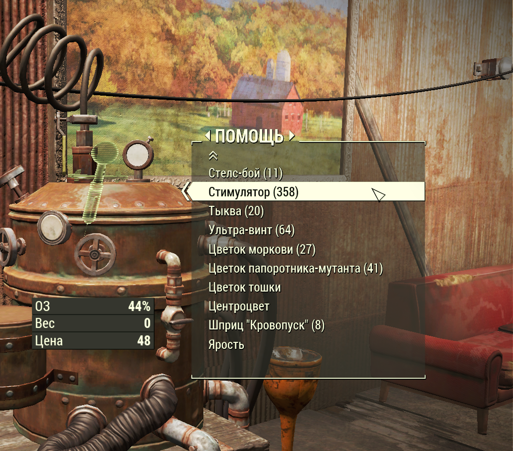 Вам не кажется что игра перенасыщена едой и препаратами ? Почти на каждом трупе какая-нибудь химия, в каждом помещении десяток и более препаратов. Почти на каждой тушке убитого животного мясо, которое можно приготовить и оно будет восполнять здоровье. В Добрососедстве можно натырить просто дохрена химии, я первое время за один раз утаскивать около посотни препаратов. У торговцев пакеты крови, которые используются при крафте многих препаратов, стоят какие-то копейки. Обыкновенный винт состоит всего лишь из пластмассы и удобрения, что позволяет его делать сотнями. Сырье САМО лезет в руки буквально везде. Просто неспеша гуляя по пустоши и отстреливая рейдеров с животными и мутантами можно забить рюкзак мясом, травой, всякими грибами и препаратами.