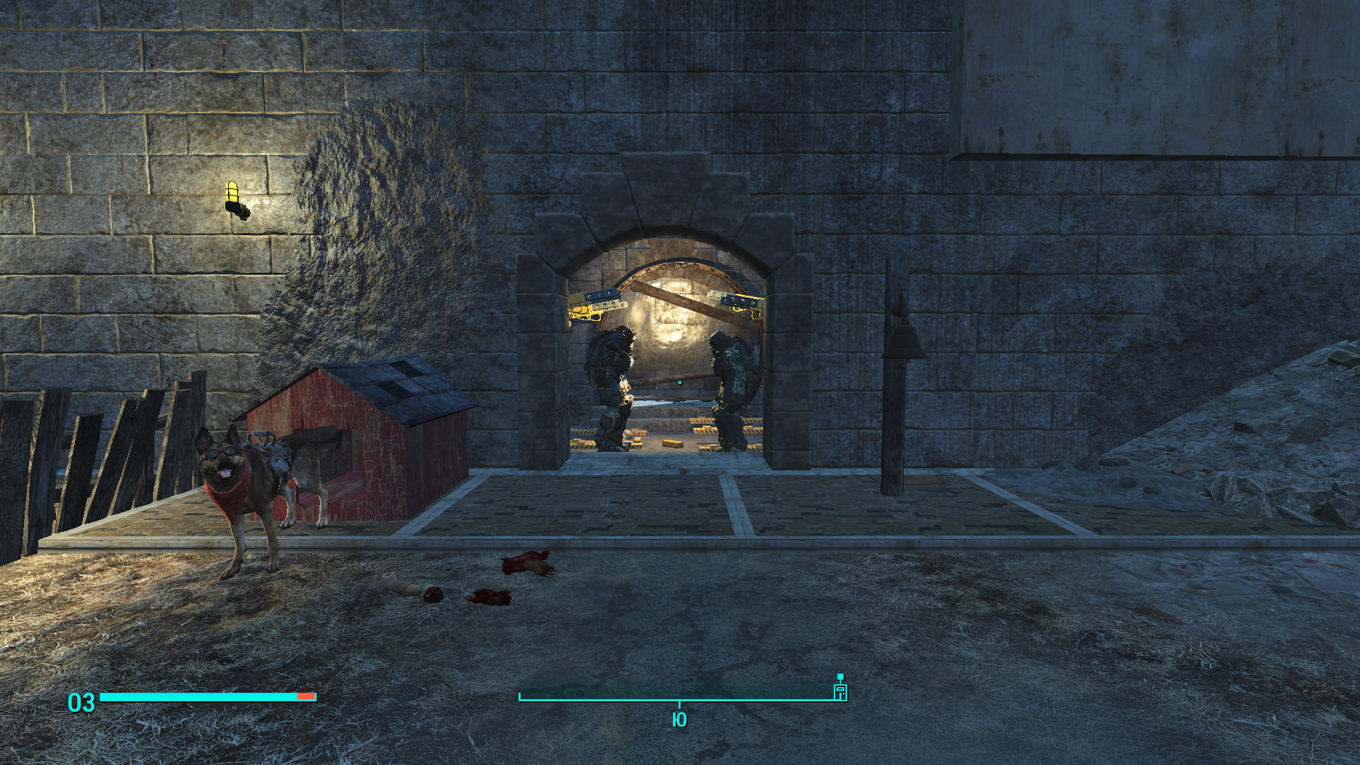 Псина охраняет силовую броню, с нарушителями поступает очень строго (если присмотреться, можно увидеть насколько строго)