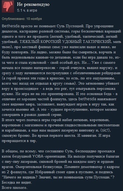 Это не игроки вечно недовольны, это проплаченные игрожуры вечно довольны. А вообще, вроде раньше и ненавидел Fallout 3, но теперь даже вспоминаю его с теплотой. Такое бывает, когда видишь что-то еще хуже. Скри По моему все очевидно. Игры - его хлеб. Если он будет говорить о нынешних бездарных играх плохо, его не будут приглашать на конференции, не будут дарить бесплатные игры, не будут заказывать рецензии. Тогда он никому не будет нужен как игрошлюха.
